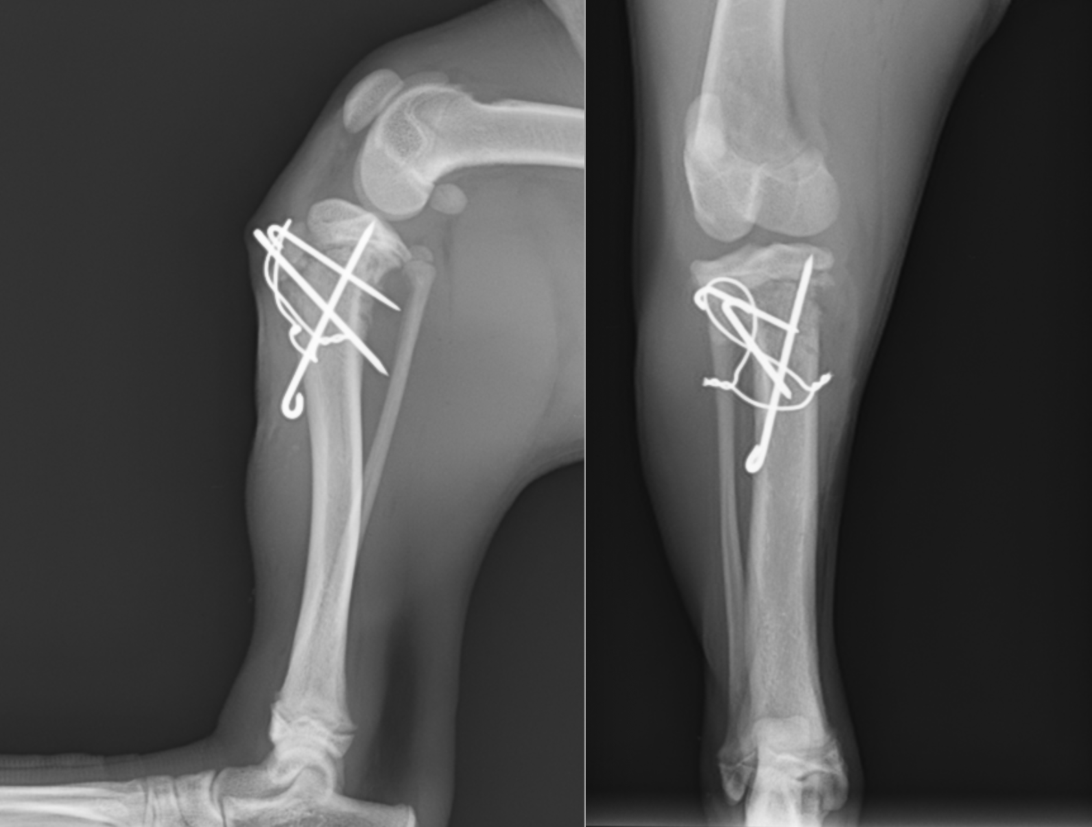 脛骨近位は血流が豊富で、特に若齢では癒合が早いため、このずれた状態のまま放っておくとその形で癒合してしまい(変形癒合)、足を着くことができなかったり、後々に前十字靭帯断裂などの重大な合併症を引き起こしてしまいます。そのため、なるべく早期に手術を行い、ずれた骨を正しい位置に戻し固定することが重要となります。