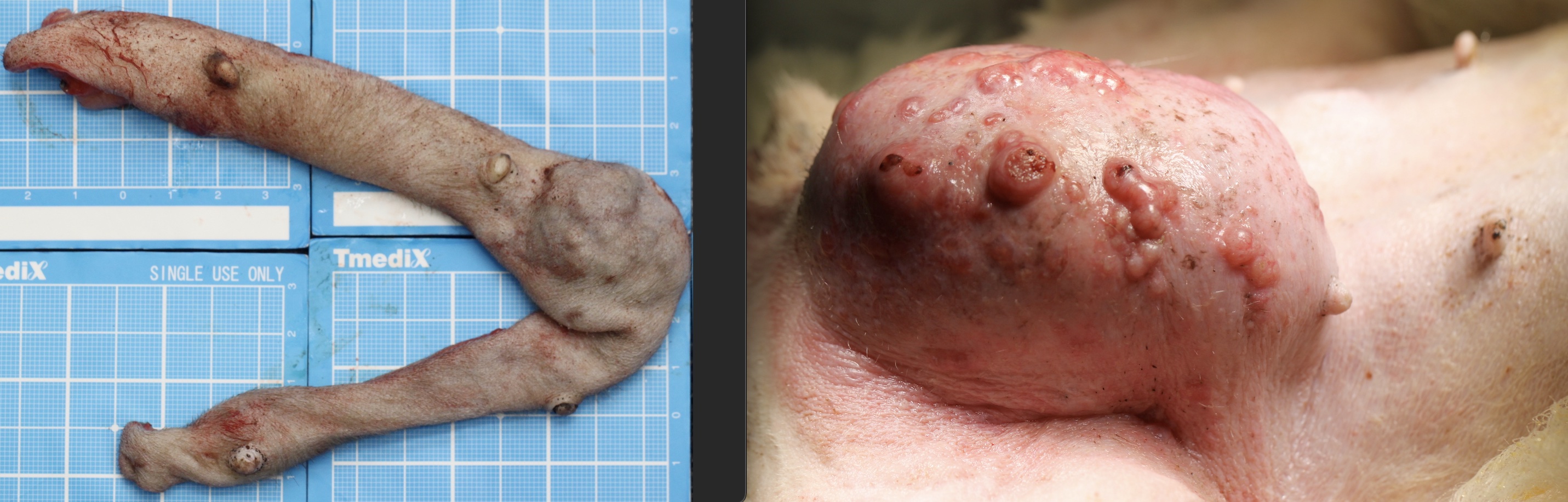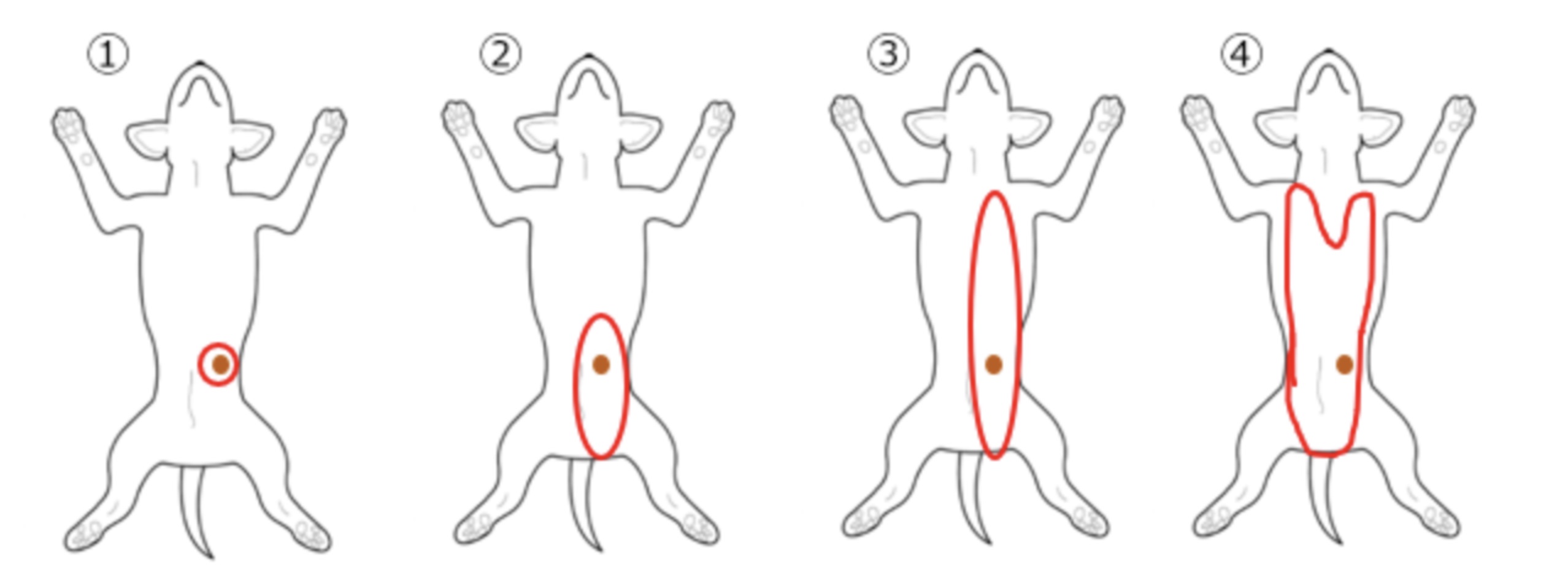 発生部位においても犬と猫では差が認められます。犬の場合、乳腺は通常左右5対存在し乳腺組織の多い4-5乳腺に腫瘍が多く発生します。