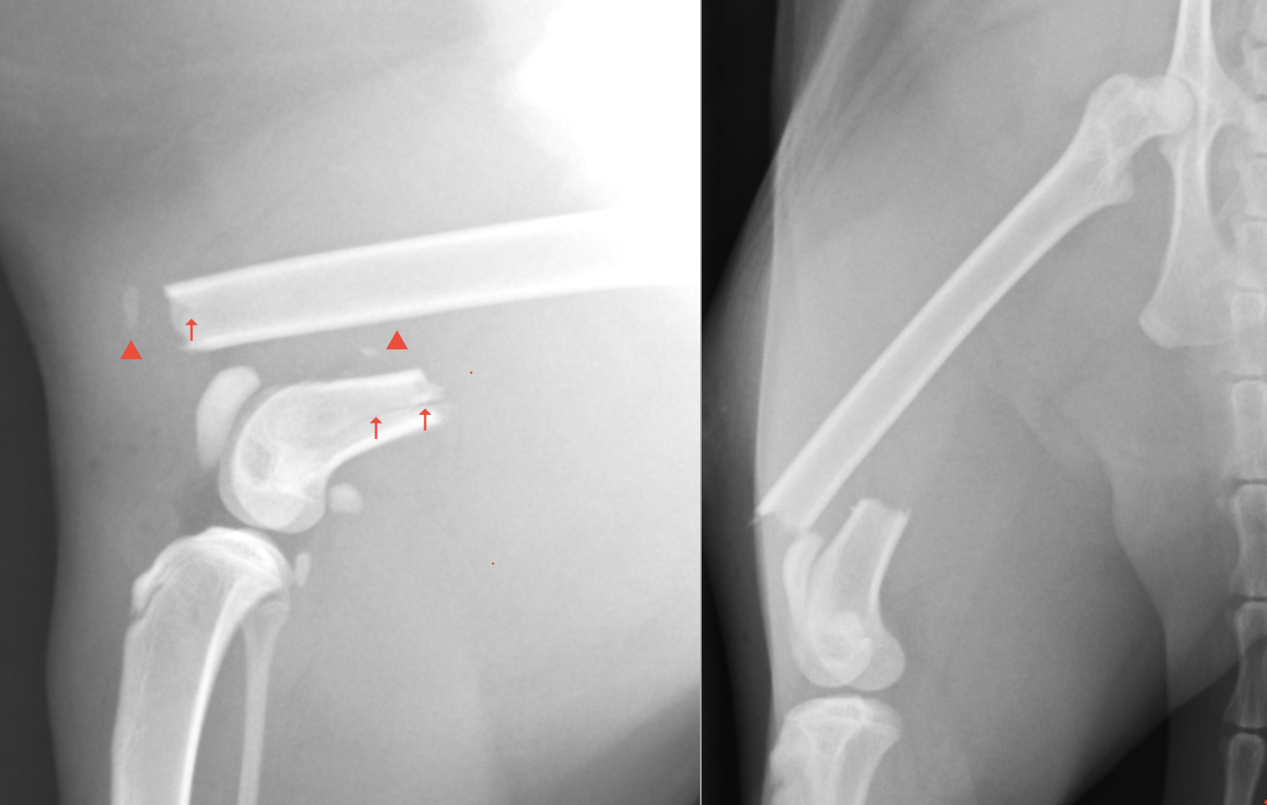 遠位がかなり短く、骨折線近くにはヒビが多数見えるため、ただの横骨折ではなく、粉砕骨折に近い病態であると考えられました。