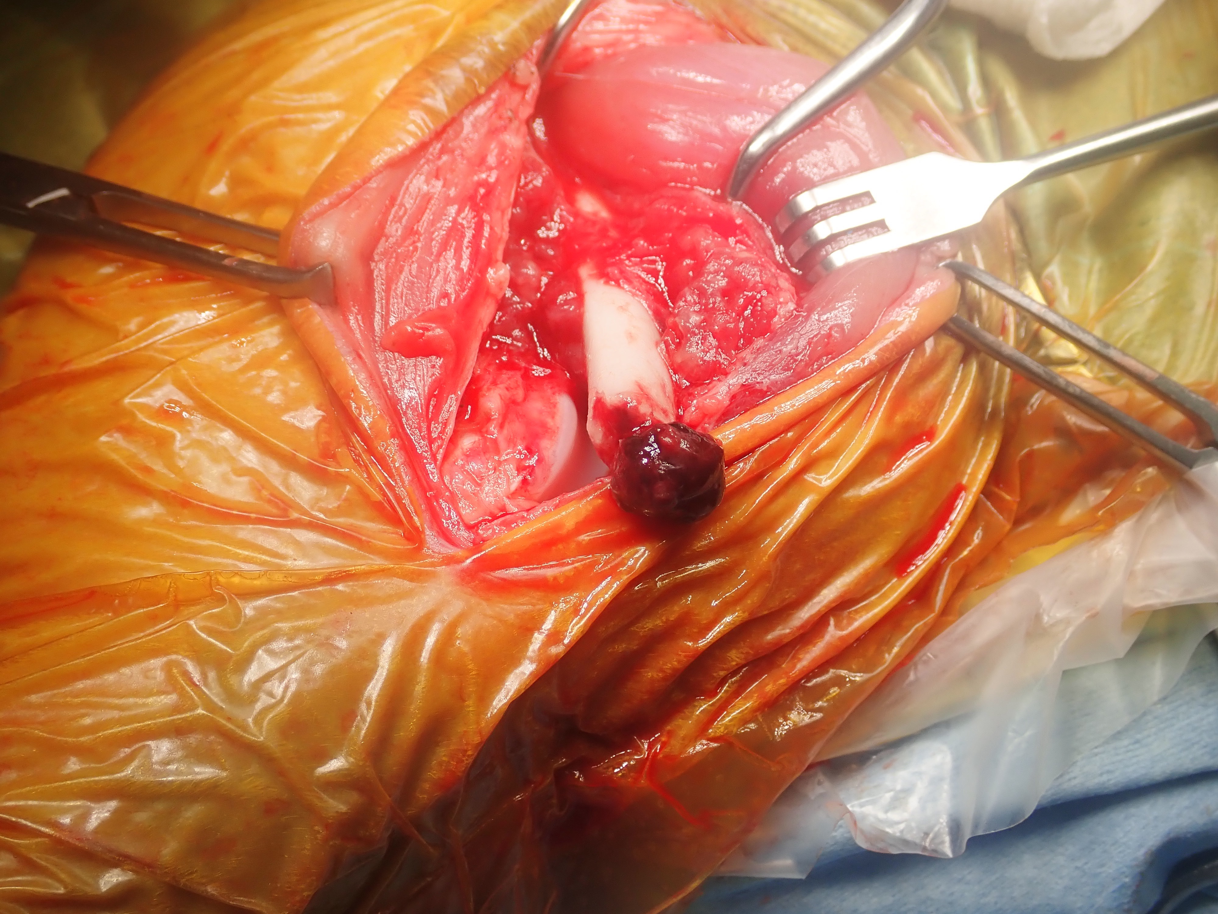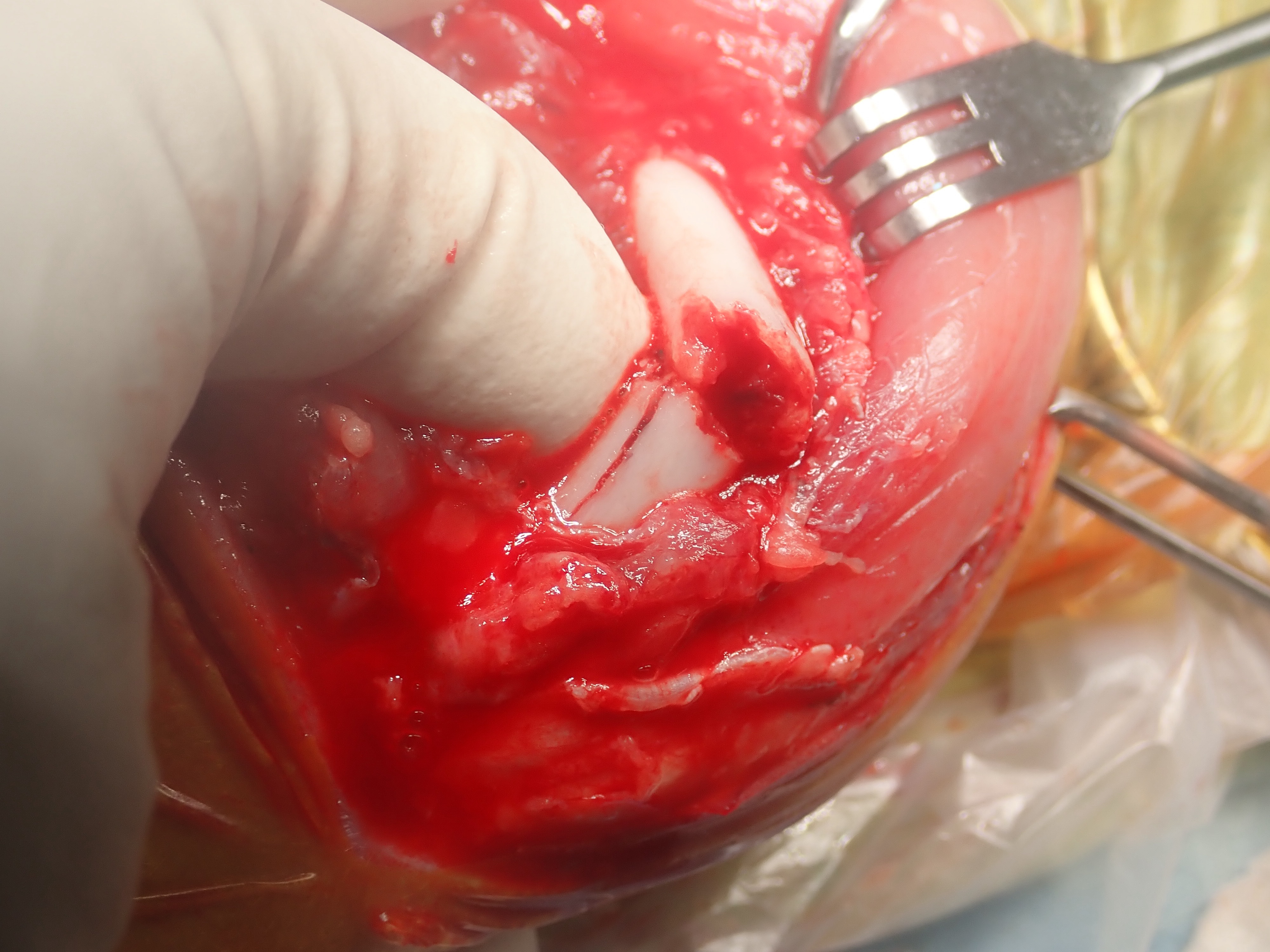 アプローチして骨を出したところです。血餅が多量に付いていました。また、周囲の筋肉はかなりダメージがありました。