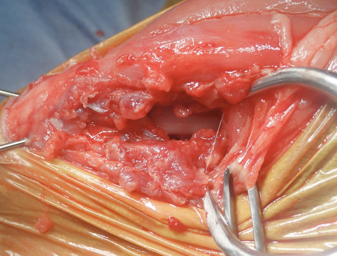 ピンを挿入後に筋肉の状態を確認しています。かなり欠損しているのが分かります。