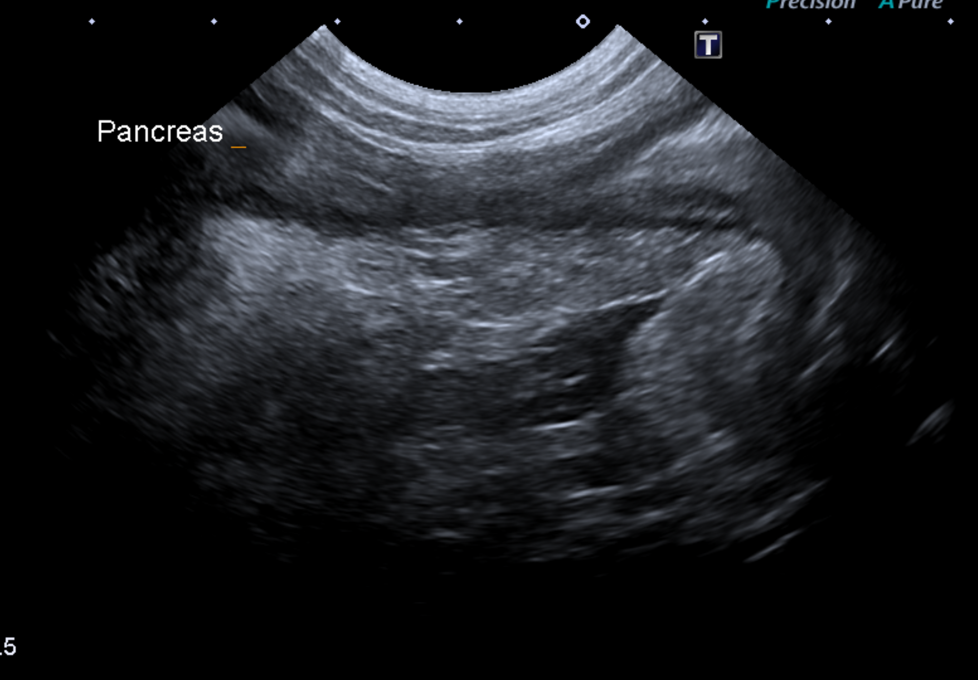 膵臓が炎症により高エコーとなりモヤモヤして見えるのが分かります。