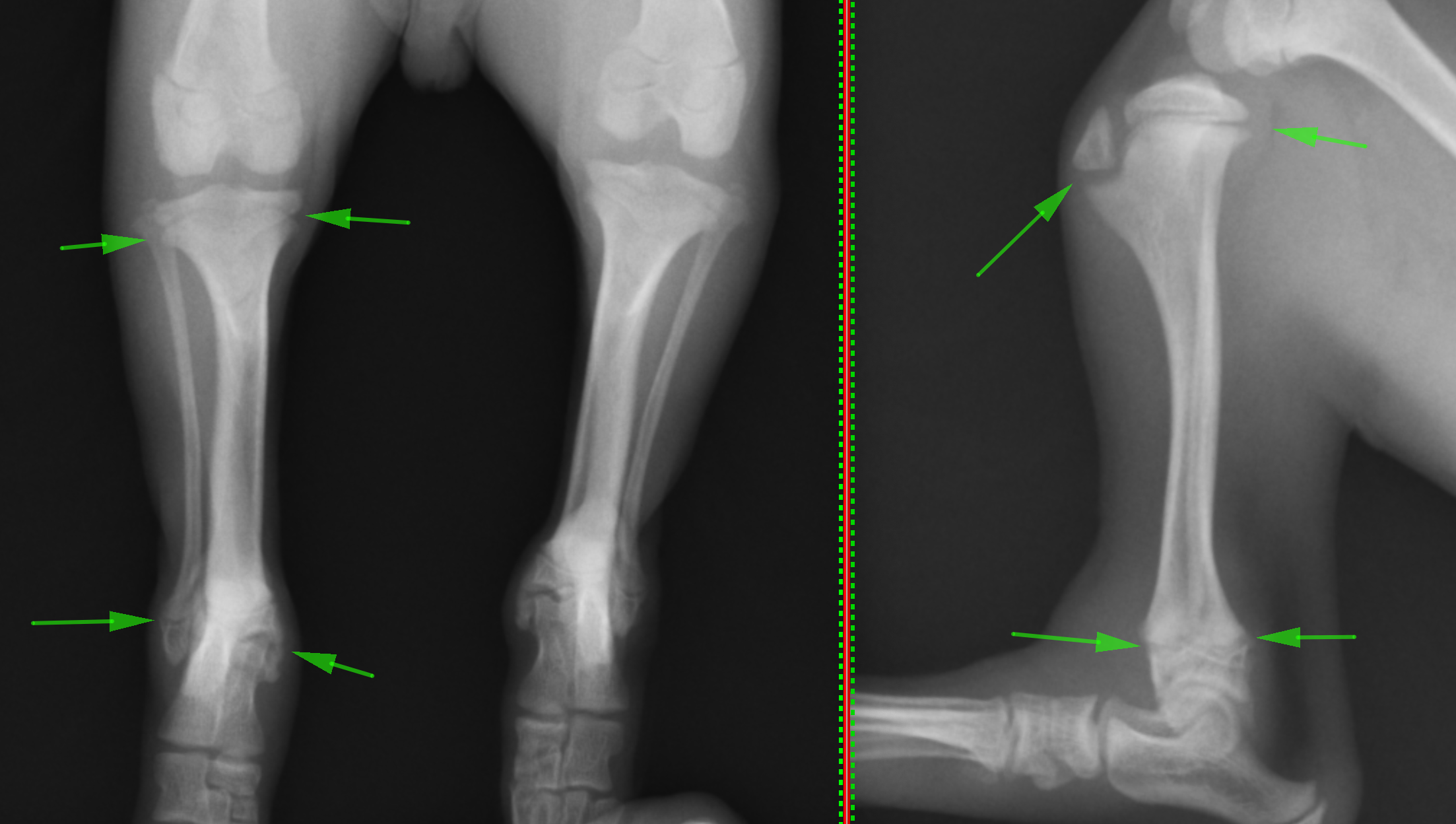 今回の症例は3ヶ月1.7kgの子犬でした。同居の犬と遊んでから右後肢を挙上するとのことで、来院されました。来院時にも右後肢は完全挙上であり、足首を屈曲進展すると痛がるのが確認されました。最初のレントゲンでは異常箇所がはっきりと分かりませんでしたが、ストレス撮影(伸ばしたり、曲げたりした状態で撮影すること)を行ったところ骨折箇所がわかりました。
