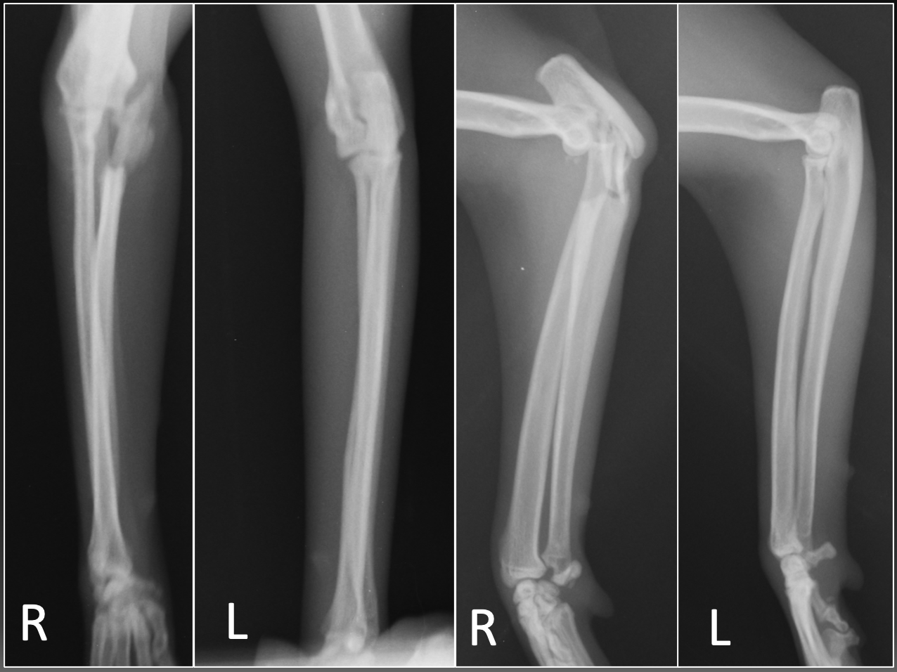 モンテジア骨折とは尺骨近位1/3の骨折と橈骨頭の脱臼を併発したものであり、後にBado(1967)らにより4つのタイプに分類され、犬や猫では稀であると報告されています。