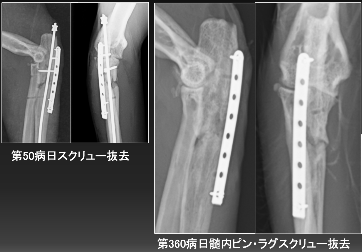 術後は段階的に、まずはスクリューを抜去し、その後骨が癒合したため、スクリューを抜去しました。プレートのスクリュー抜去時には骨は癒合し、一本の骨になってくれているのがわかると思います。また、症状も改善し、通常通りジャンプして生活できるようになっていました。