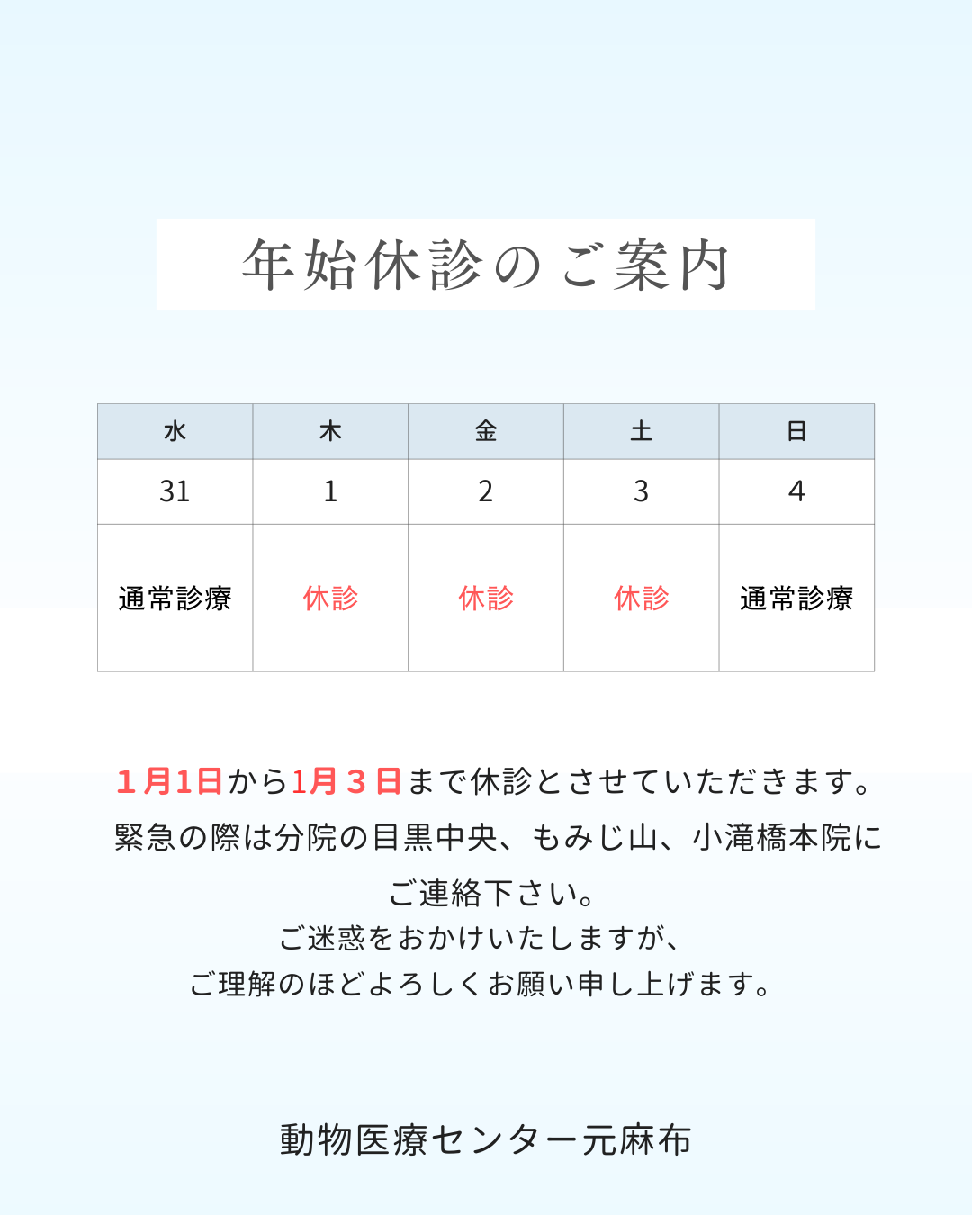 いつもご利用いただきありがとうございます。 年末年始の診察についてですが当院は下記の日程で休診になっております。 患者様には大変ご不便をおかけ致しますが、何卒、宜しくお願い申し上げます。