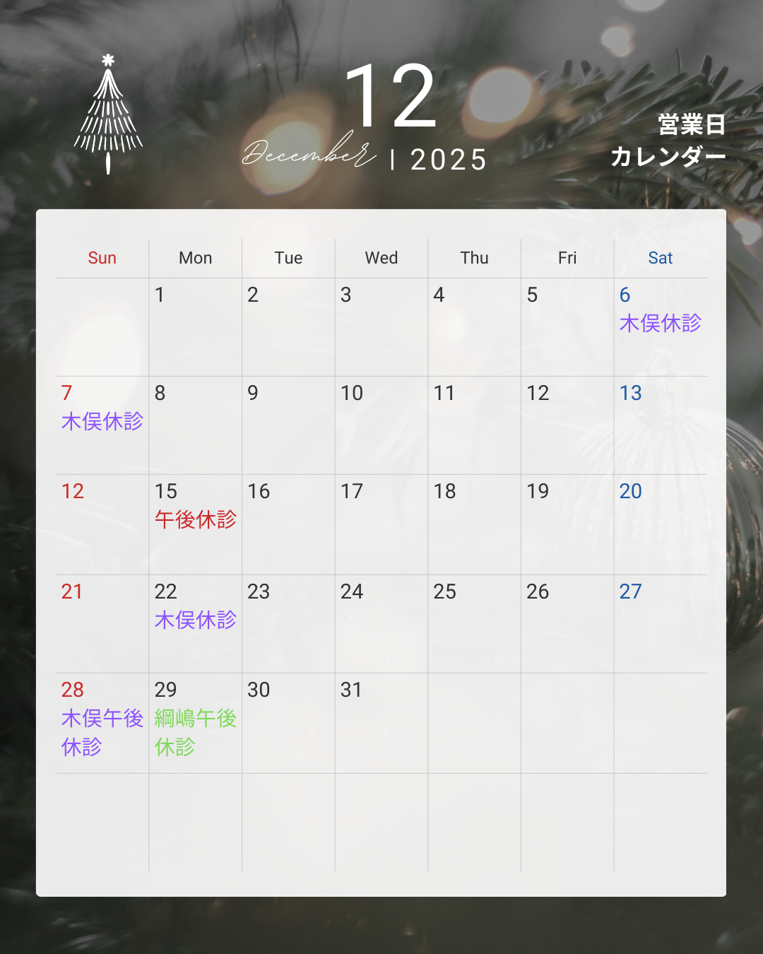 12月15日の午後4時以降の診察は、社内研修のため臨時休診とさせていただきます。