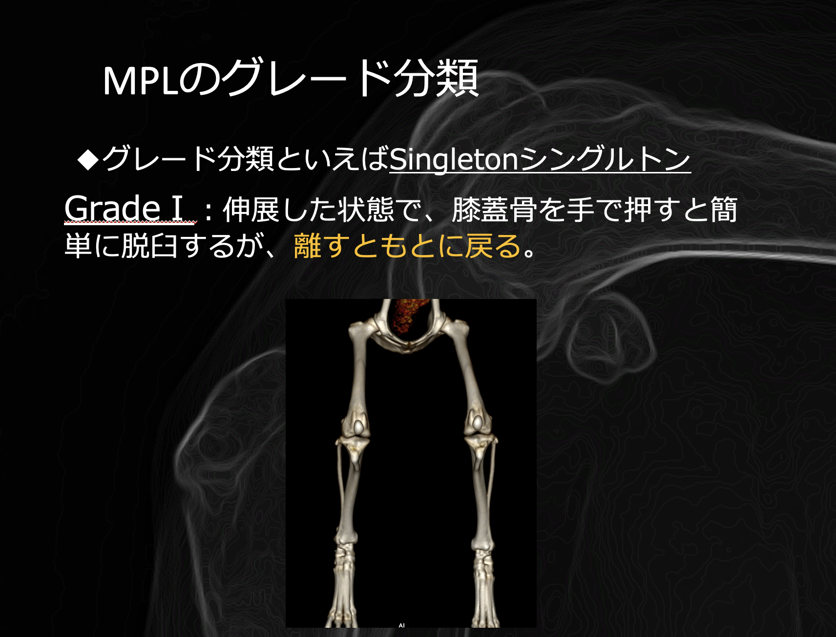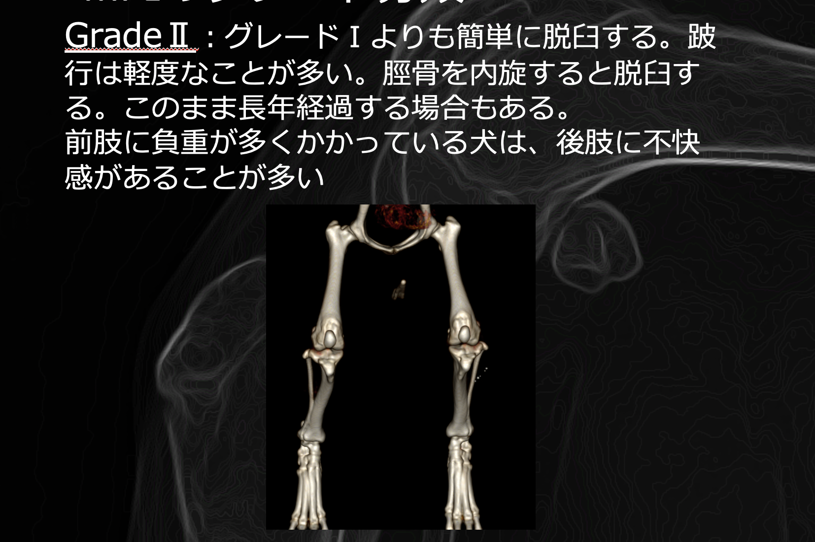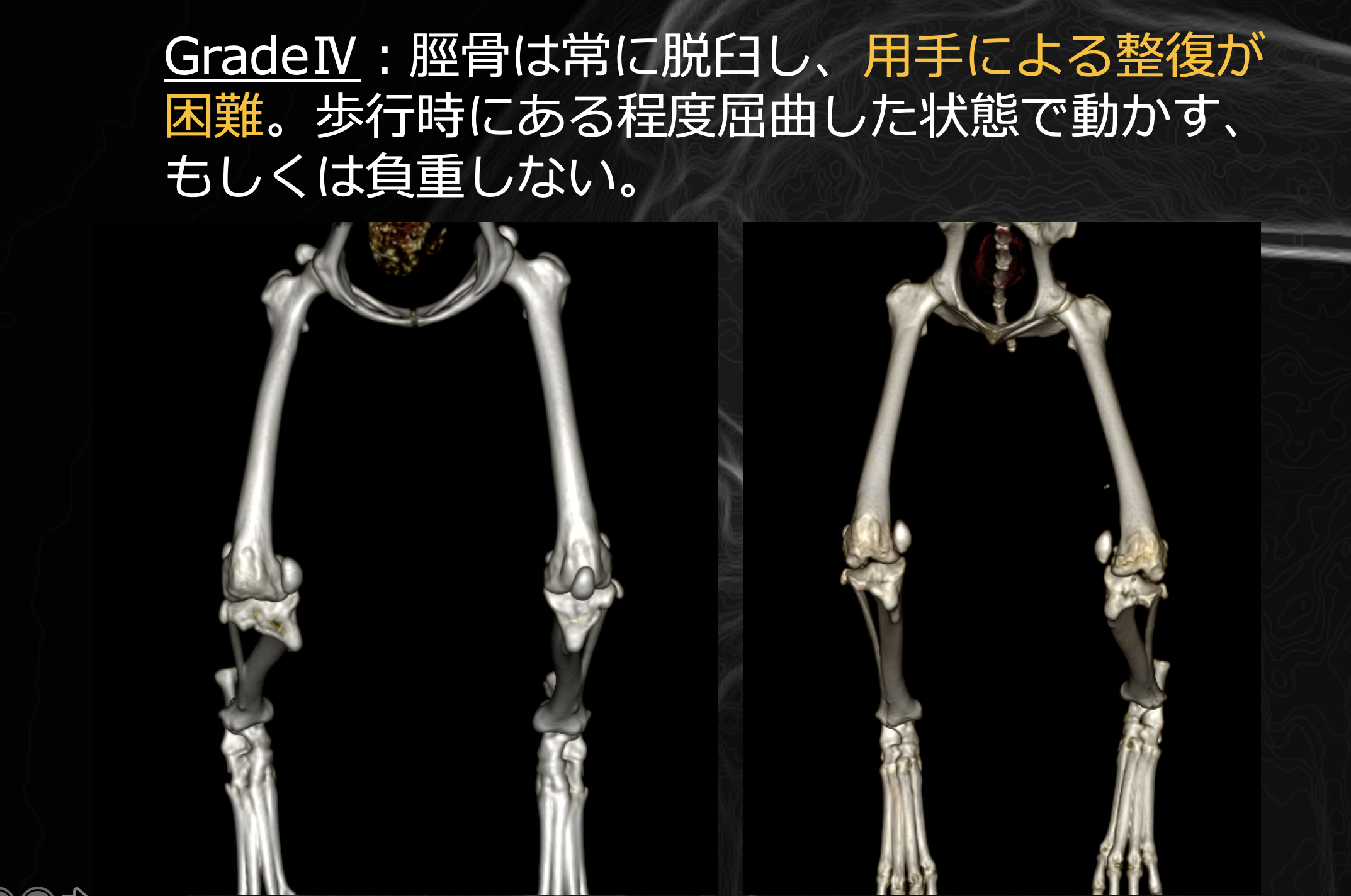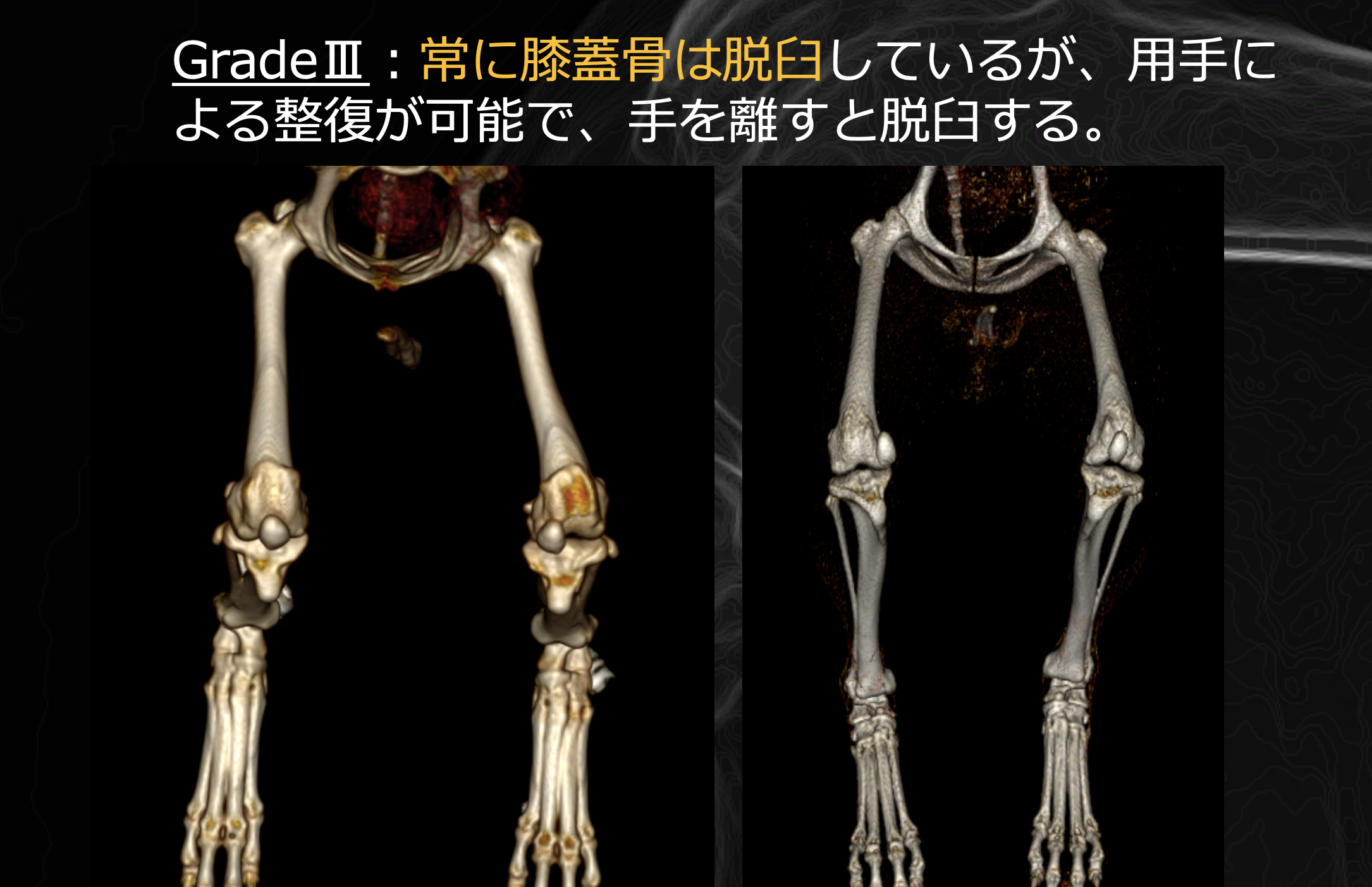 一概にパテラの脱臼と言っても様々なタイプが有り、よく使われるのがシングルトンのグレード分類です。グレード1は徒手によって押すと脱臼するタイプ、グレード2はグレード1よりも自然に脱臼するが、基本的には脱臼していないタイプ、グレード3は基本的に脱臼してしまっているが、徒手で戻すことができるタイプ、グレード4は最も重度で、常に脱臼している状態で、徒手で戻すこともできないタイプです。