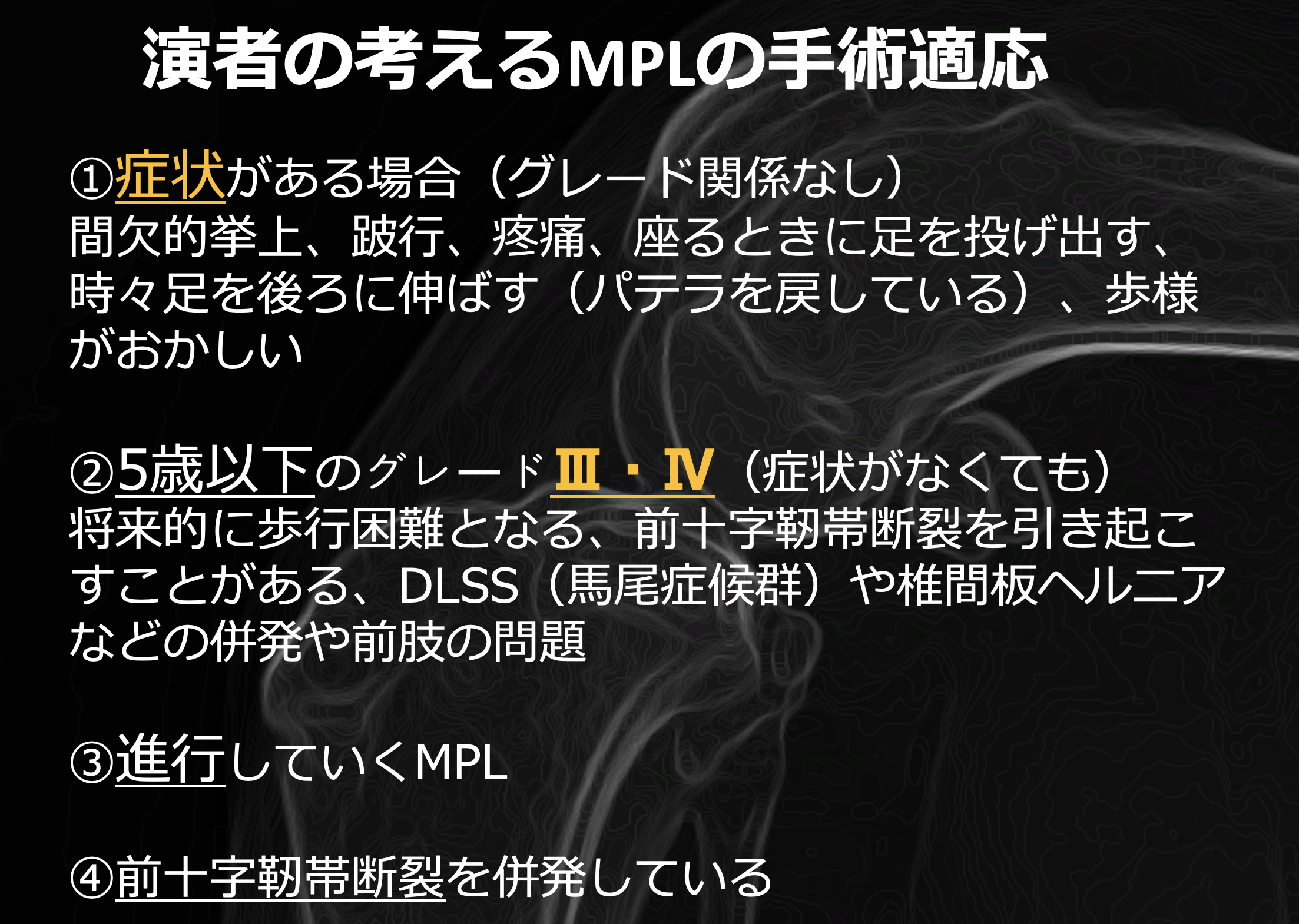 特にグレード4では骨の形態異常も多く難易度が高くなります。パテラの脱臼があるからといって、全てが手術適応というわけではなく、その適応基準というものがあります。決められたガイドラインがあるわけではないですが、適応となるのは、症状がある場合(跛行:けんけんする、挙上:足を上げる、足をよく伸ばしている、お姉さん座りする、痛がるなど)、グレードが3.4の場合、進行している場合(例えば1ヶ月前はグレード1だったのが、2になっているなど)、前十字靭帯断裂を併発している場合などです。
