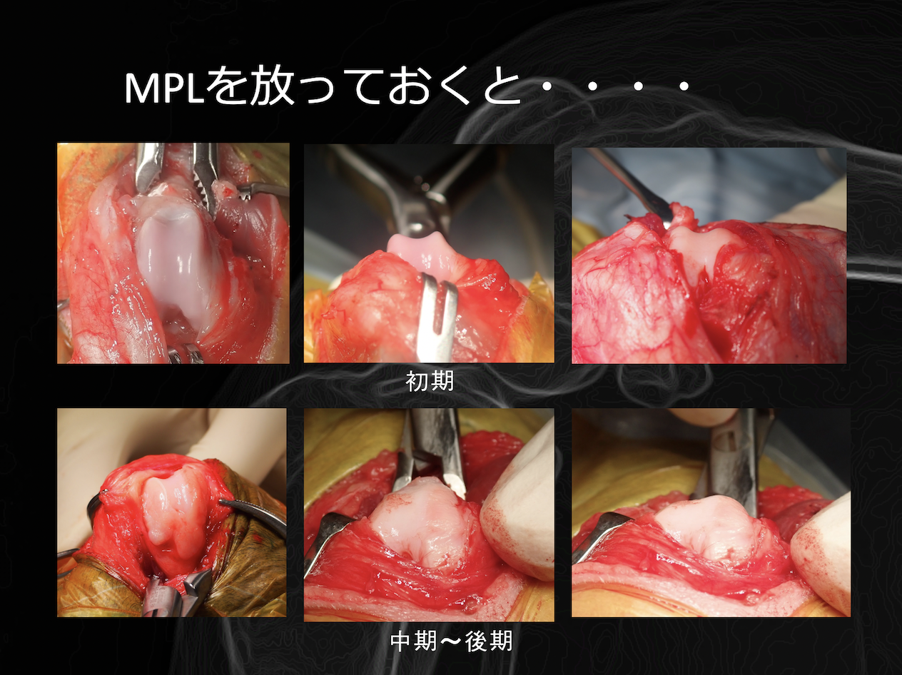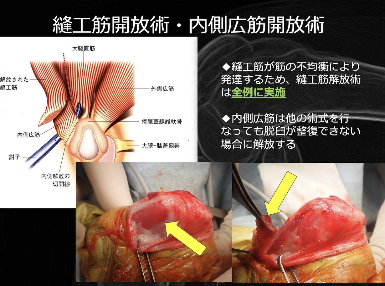 内側支帯リリースです。縫工筋や内側広筋を一部外し緩める術式です。関節包も同時に切開します。