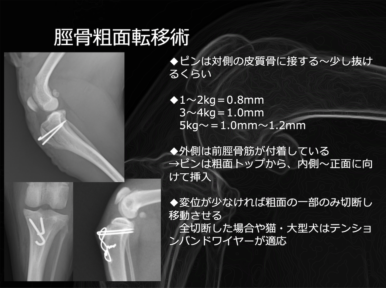 脛骨粗面転移術です。下の脛骨と呼ばれる骨の、粗面という部分を一部切断し、外側にずらし、ピンで固定しています。このピンは抜かなくて大丈夫です。