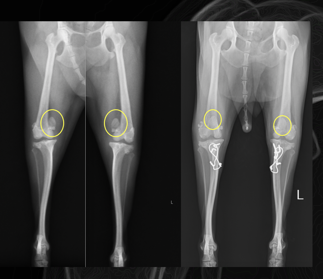 両側脱臼の場合片側ずつやる場合もありますが、基本的には両側同時に手術する場合が多いです。両側同時の方が、術後の足のつき方が良いケースが多く(両側だと着かざるを得ないため、回復が早くなります)、麻酔も1回で終了するためです。最近では年間で40から50件ほどのパテラのオペがあり、関節疾患の中では多い疾患となっています。