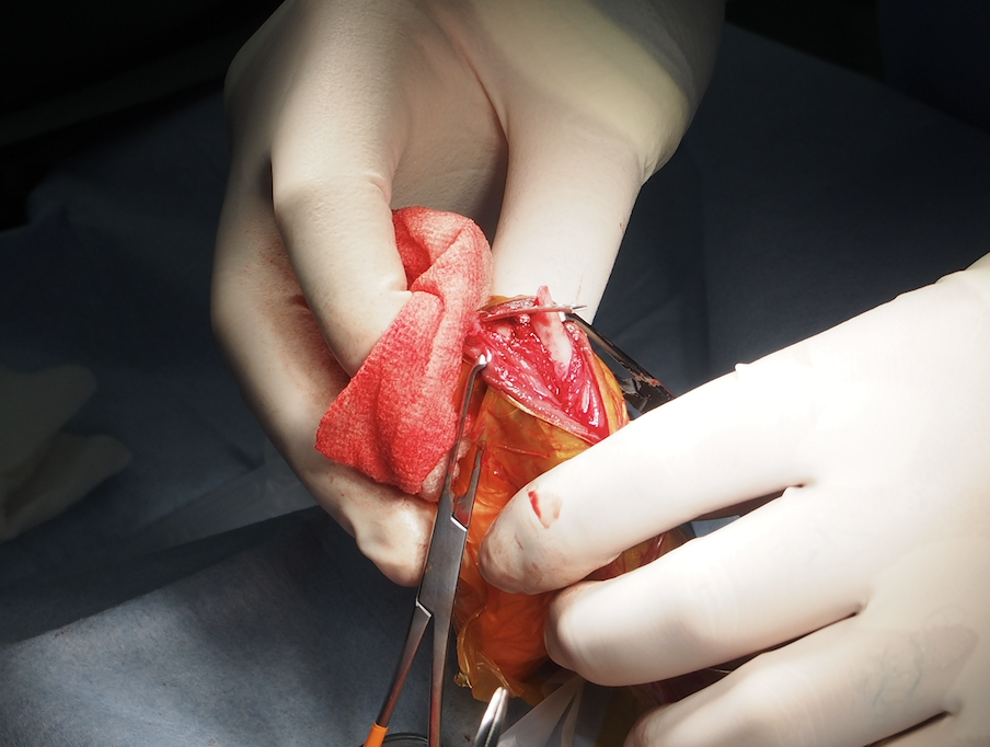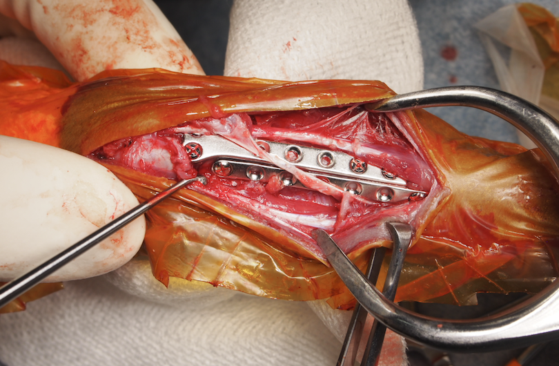 折れた骨にプレートを当てているところです。骨折部位もわかるかと思います。