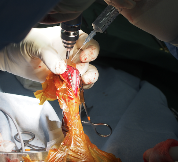 医療用ドリルを用いて骨に穴を開けているところです。このように下穴を開けてから、スクリューを打ち込んでいきます。