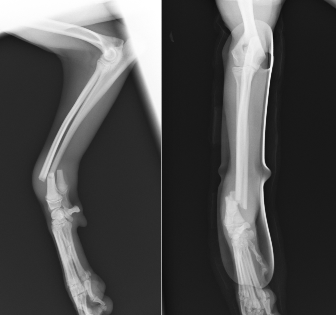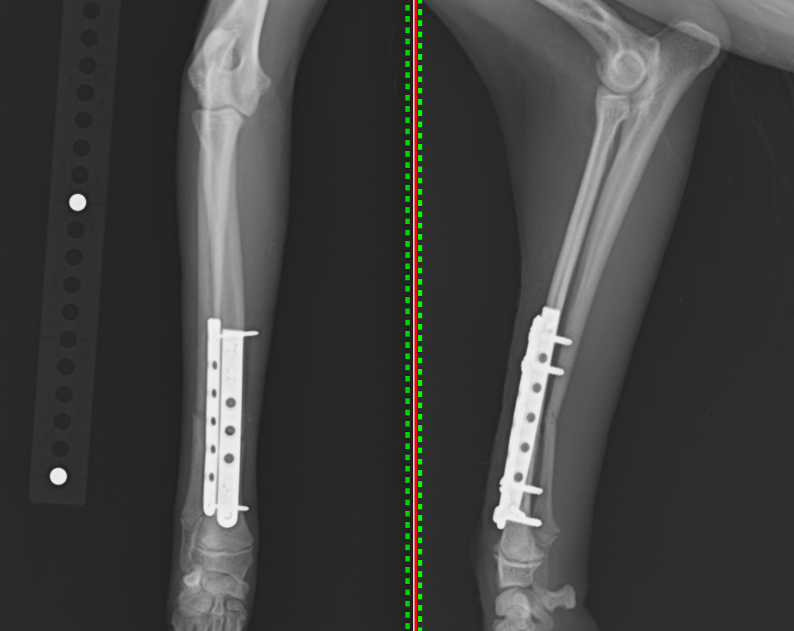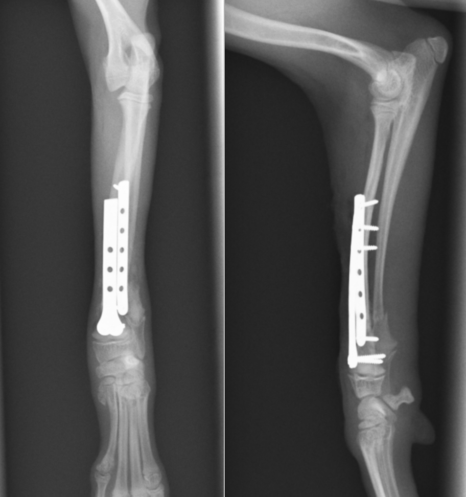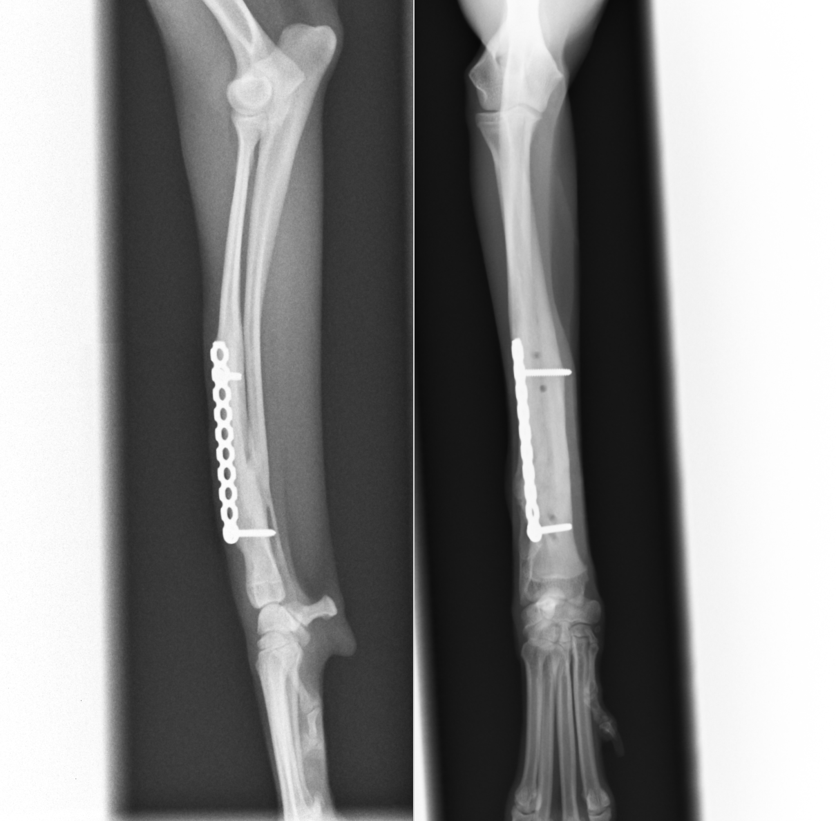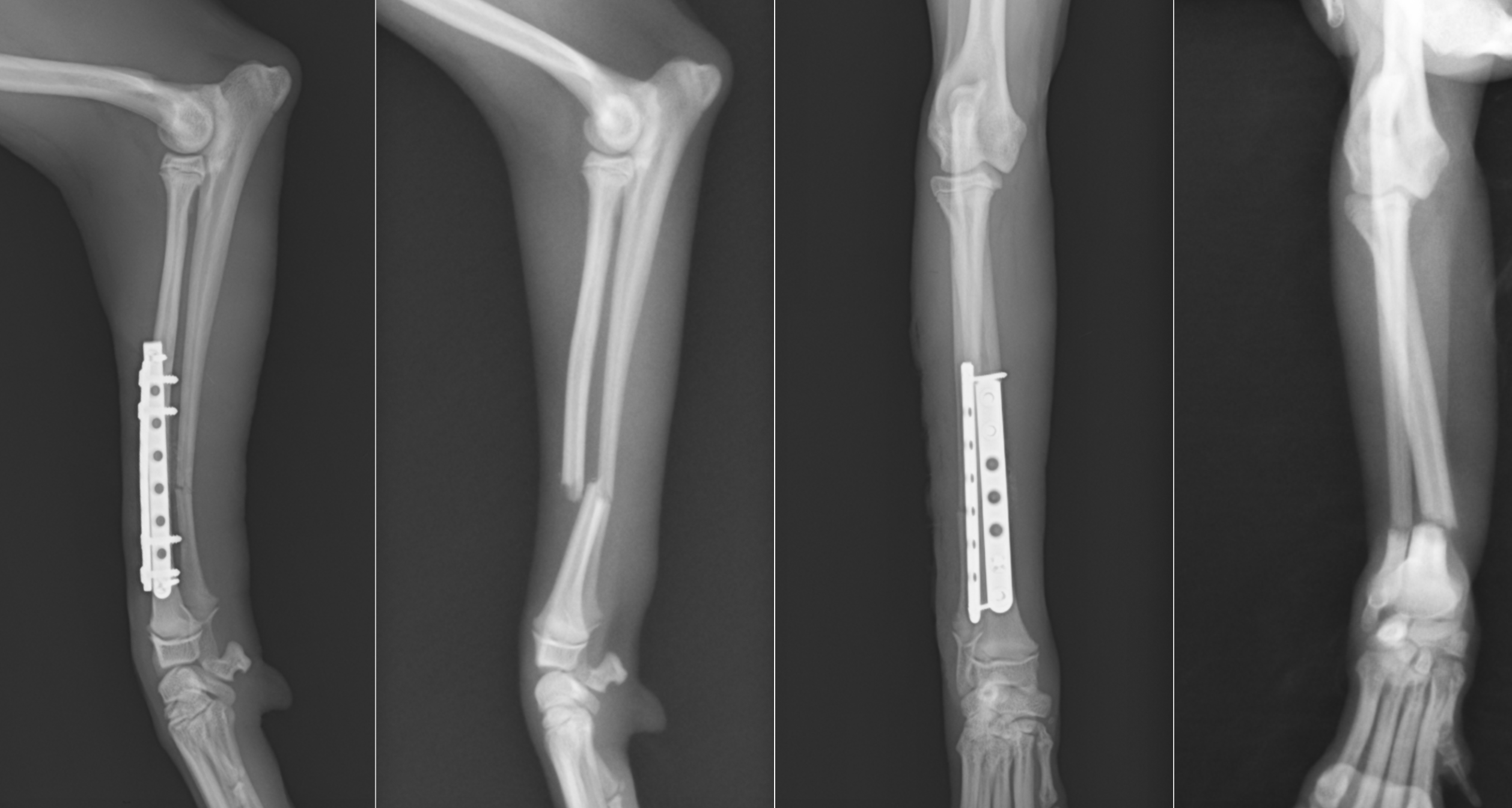 今回の子は体重1.7kgで骨も細かったため、1.3mmと1.1mmのプレート・スクリューを選択しました。このように、体重や骨の太さ、活動性に基づきプレートやスクリューを選択し、形に合わせてプレートを曲げたり、捻ったりして骨に合わせていきます。1週間で退院となりますが、退院時には4本足で歩いて帰れることがほとんどです。2週間後には抜糸となり、28〜42日後には正面のプレートを抜去していきます。そうすることで、プレート抜去後の再骨折を可能な限り最小限にすることが可能となります。少し前に手術を行い、すでに骨折が癒合している子をご紹介します。