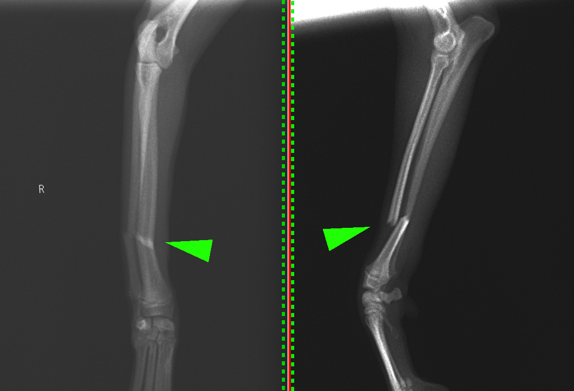 犬は後肢の筋肉のほうが大きく見えるため、後肢の方に負重が多いと思われがちですが、実際に測定していくと前肢に体重の6割、後肢に4割という報告が出ています。後肢は瞬発力を引き出す力が大きいのですが、普段生活している分には前肢の方に体重がかかっているのです。また、トイプードルやポメラニアン、ヨークシャーテリアなどは体重の割に足が細長く、前足の負担が大きいことも相まって、ちょっとした段差から落ちただけでも骨折してしまうというケースが多く見られます。今回ご紹介するのも、散歩中に道の段差を飛び越えようとしたら転んでしまい、その後から前肢を挙げてしまうという主訴で来院されました。今回ご紹介するのはトイプードル4ヶ月齢、体重1.7kg(!!)の子で、X線を撮影し左前肢の橈尺骨骨折と診断しました。