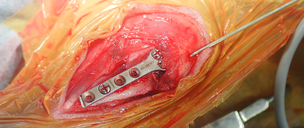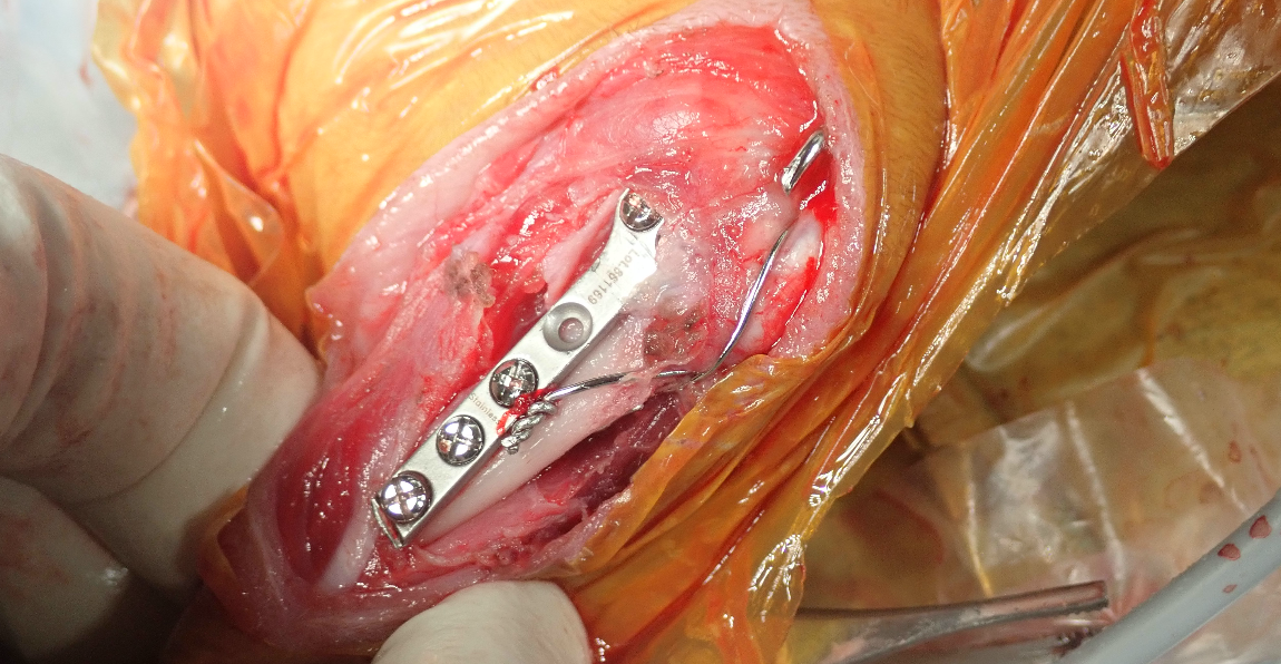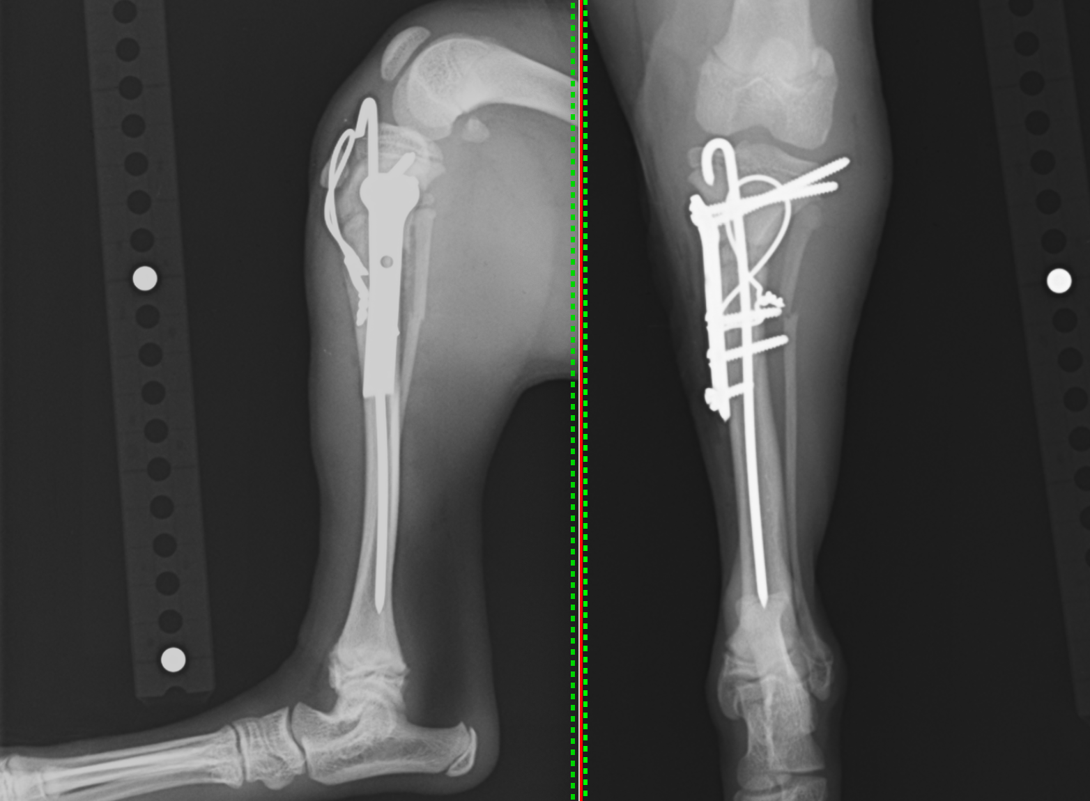 手術では髄内ピンというピンを用いて、折れ曲がりの方向に強度をもたせます。髄内ピンだけですと骨の回転が抑えられないので(ピンを軸に回る動きが出てしまう)、回転抑制のプレートを設置します。この方法を専門用語でプレートロッド法といいます。さらに、脛骨近位は膝蓋骨が付着しており、大腿四頭筋という後肢で最も強い筋肉が上に牽引する力が強く働きます。そのため、プレートを入れても後屈してくる事が多いので、それを予防するためにテンションバンドワイヤーを設置します。