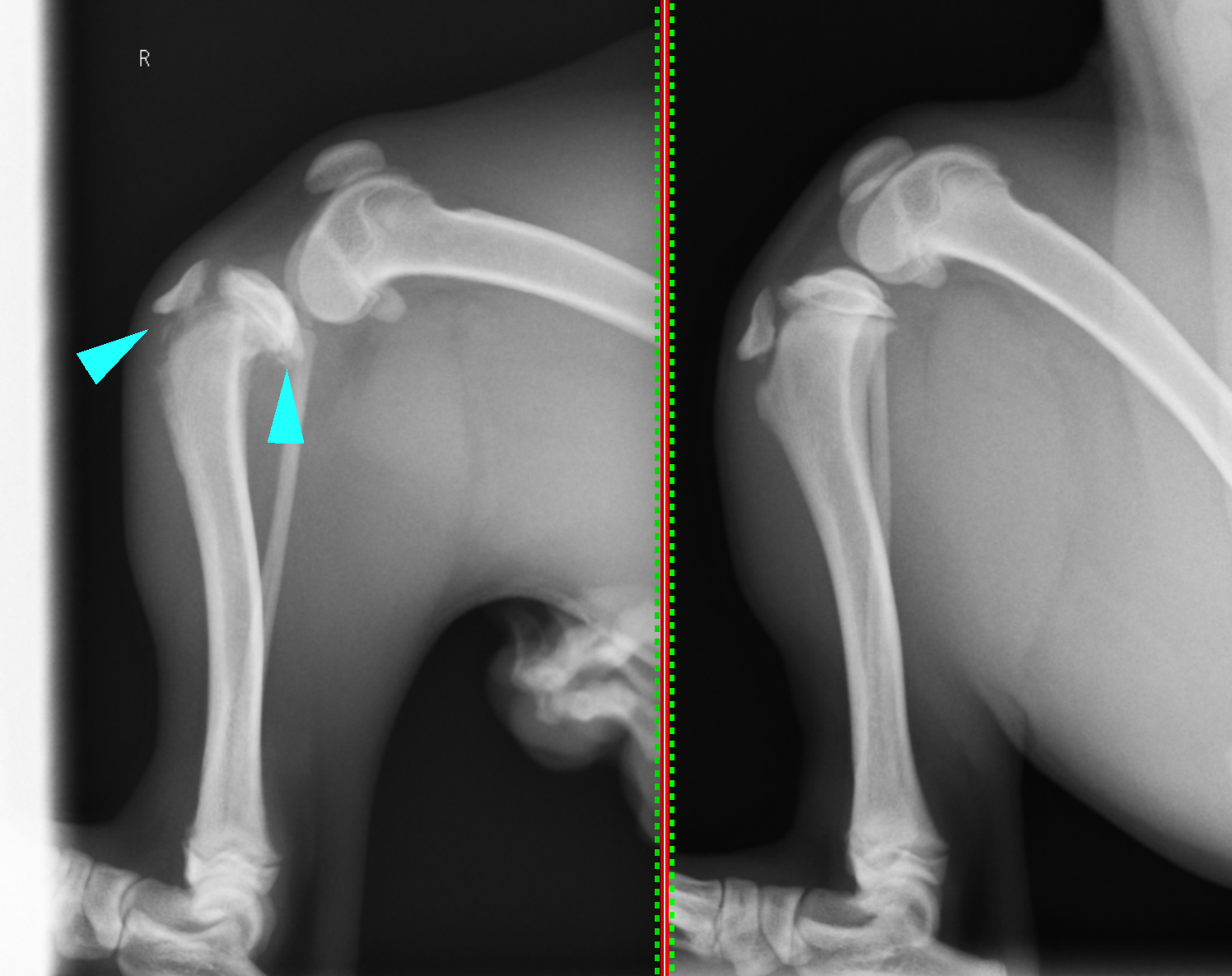 触診上右後肢の筋肉量の低下が認められ、X線画像検査を行うと脛骨近位が骨折しているのが確認されました。