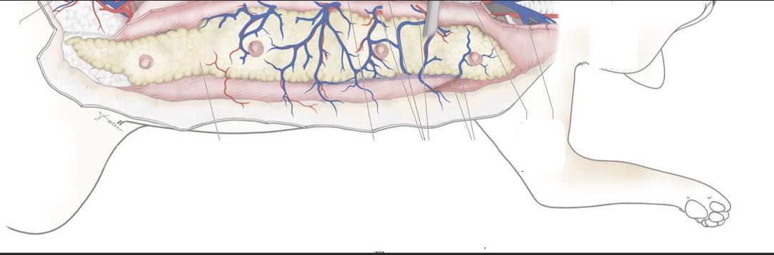 発生部位においても犬と猫では差が認められます。犬の場合、乳腺は通常左右5対存在し乳腺組織の多い4-5乳腺に腫瘍が多く発生します。