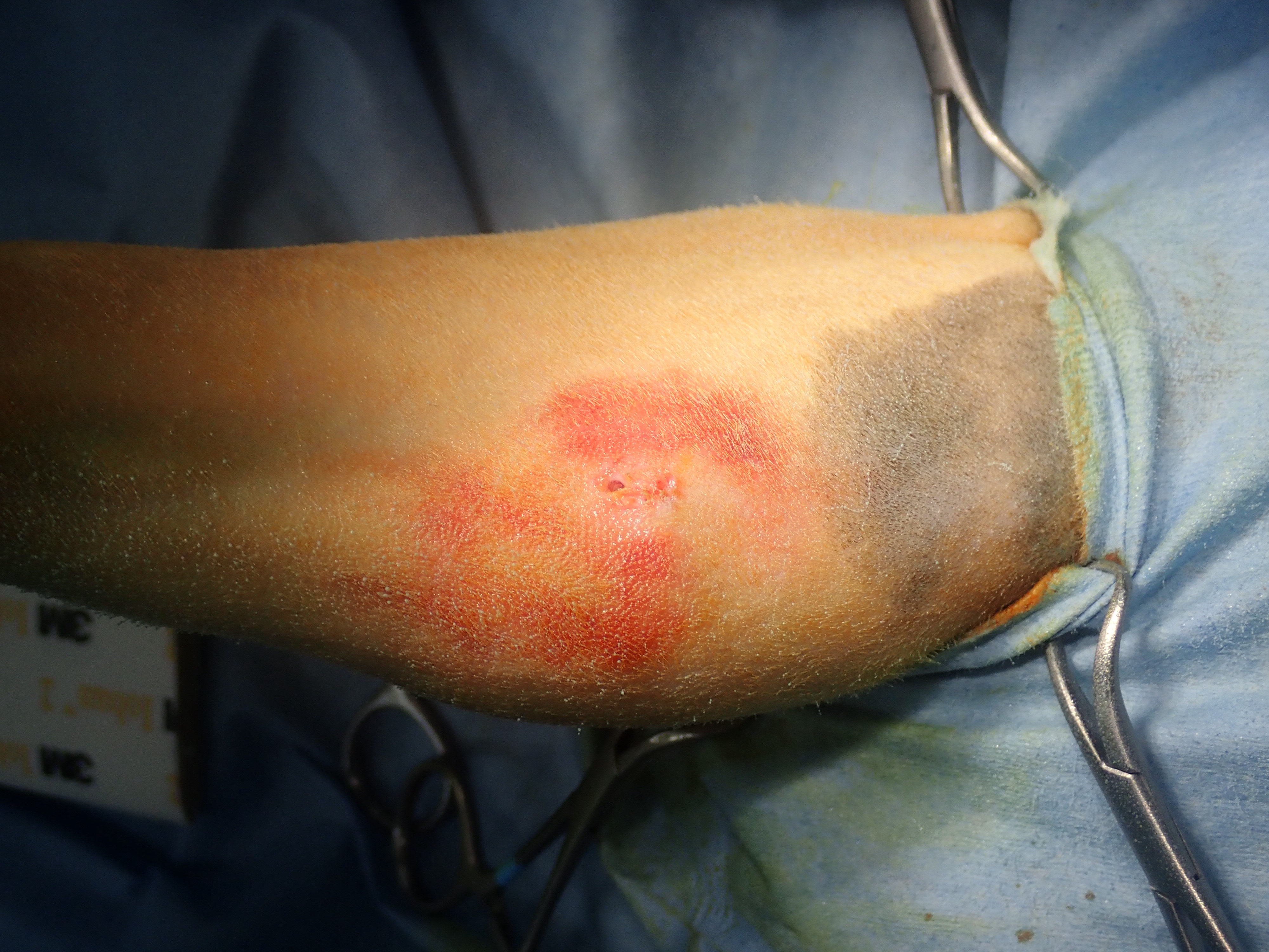術前の皮膚ですが、一部穴が空いて外に骨が飛び出していたと考えられます。後ほど行った感受性テストは陰性でした(感染は成立していなかった)。