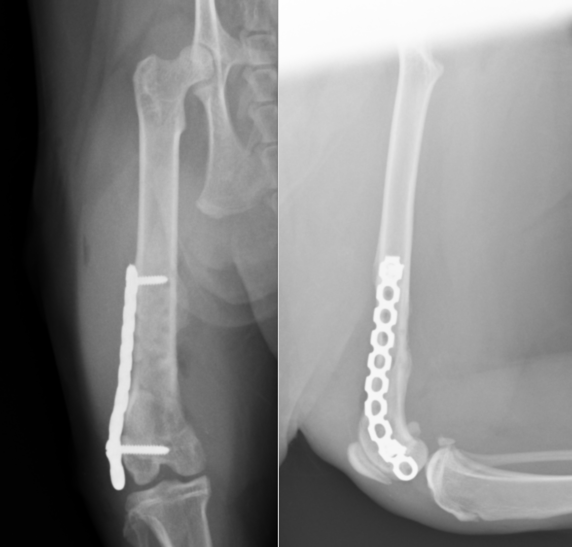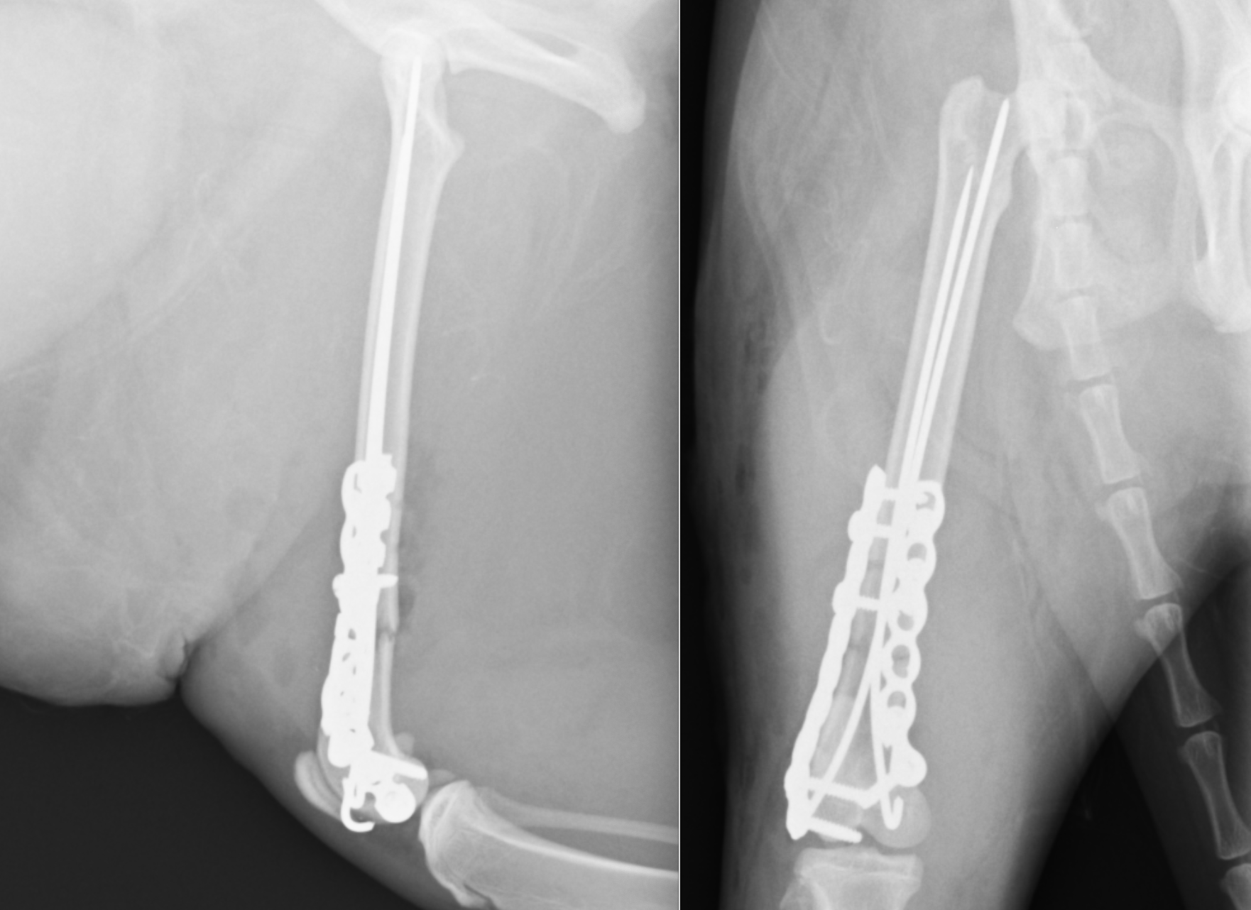 治療は手術による固定が必要で、骨折線近くにはインプラントの挿入は困難であると予想されたため、まず最初に長さを維持する髄内ピンを挿入しました(長いピン)。それによりある程度の位置は合ったため、その状態で、外側にプレートを設置しました。外側には2本しかスクリューを入れられなかったため、ロッキングスクリューを入れ固定しました。その状態で、内側の骨片に欠損が見られたため(おそらく欠けた骨)、内側にも補助的にプレートを設置しました。