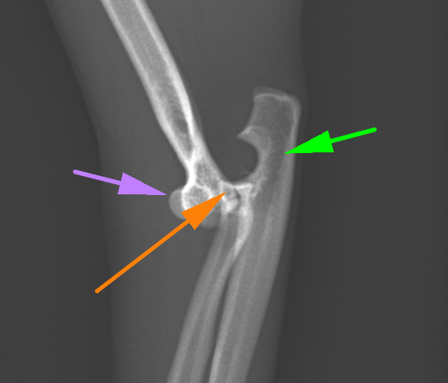 こちらが患肢の横から見たX線です。紫が上腕骨で、オレンジが橈骨、緑が尺骨です。このX線だと、上腕骨と橈尺骨が離れているのが分かると思います。橈骨と尺骨の脱臼はよくわかりません。