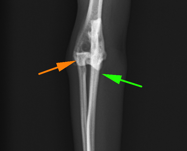 患肢を正面から見たX線画像です。オレンジの橈骨と緑の尺骨が離れており、脱臼しているのが分かります。
