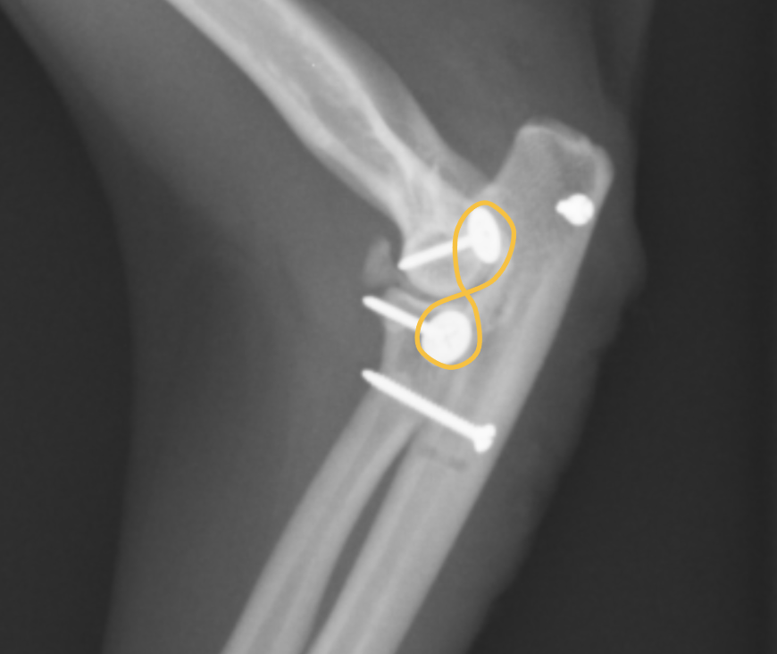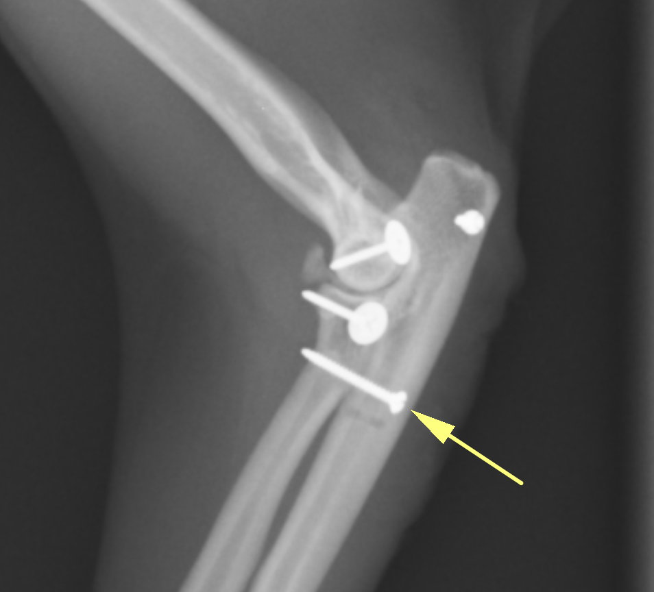 この黄色の矢印のスクリューが尺骨と橈骨を固定しています。