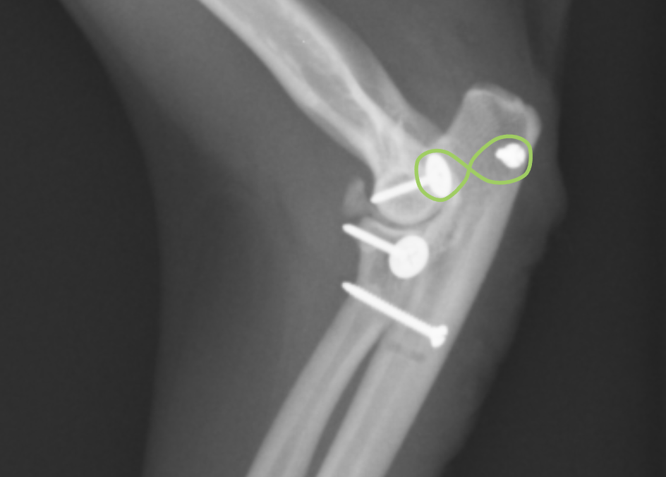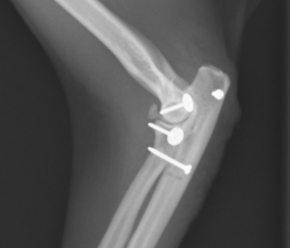 手術ではまず輪状靭帯の再建を行いますが、靭帯を縫合してもすぐに断裂してしまうことから、尺骨から橈骨に向けて一本のスクリューを打ちます。この方法で尺骨と橈骨を固定します。固定すると、腕を捻る方向は動かなくなるため、猫の場合、猫座りやよじ登るときにねじるような動きはやりにくくなります。