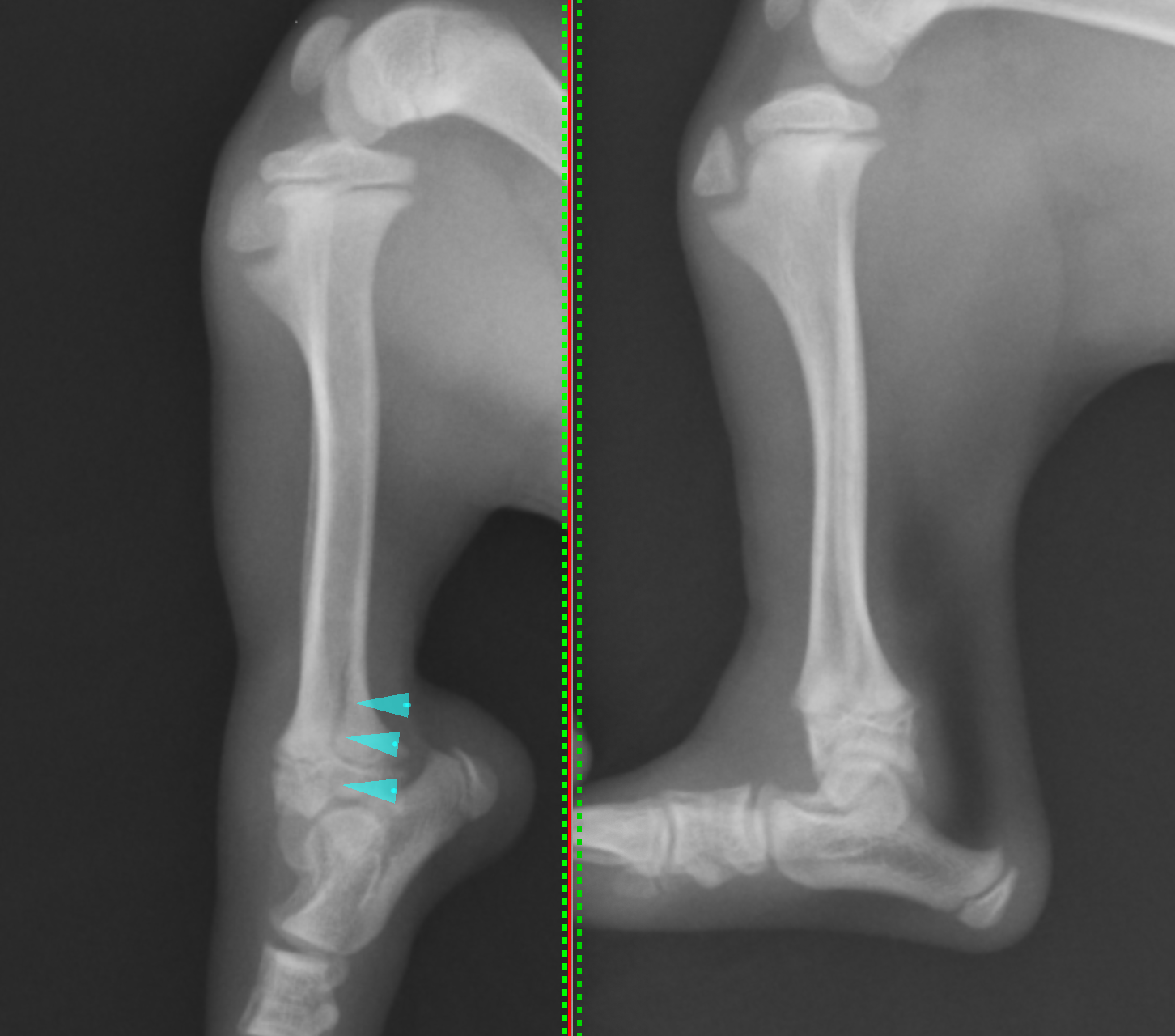 今回の症例は3ヶ月1.7kgの子犬でした。同居の犬と遊んでから右後肢を挙上するとのことで、来院されました。来院時にも右後肢は完全挙上であり、足首を屈曲進展すると痛がるのが確認されました。最初のレントゲンでは異常箇所がはっきりと分かりませんでしたが、ストレス撮影(伸ばしたり、曲げたりした状態で撮影すること)を行ったところ骨折箇所がわかりました。