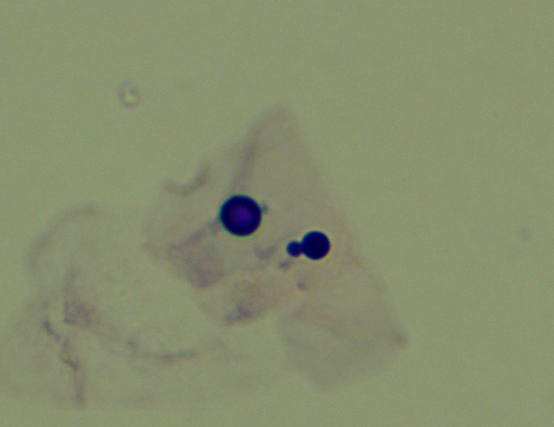 【検査】 ・病変部角質または耳垢の押捺塗抹検査(スタンプ検査) 顕鏡して、400倍視野で複数の菌体を認める