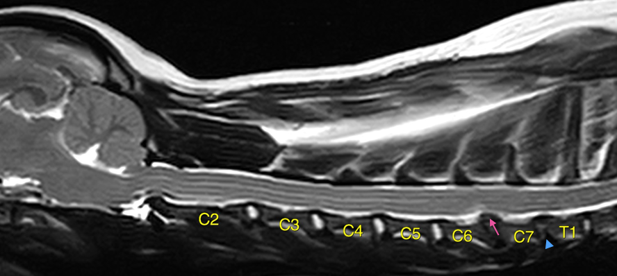 図2 頚部MRI(T2強調画像) 変性した椎間板は白さが無くなる(青矢頭)、椎間板物質が脊柱管内に突出して脊髄を圧迫した状態が椎間板ヘルニア(ピンク矢印)