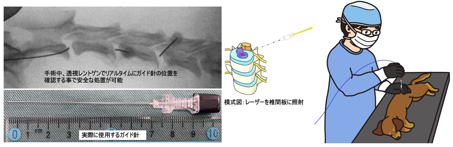 また、圧迫が軽度でも痛みが強かったり・繰り返しているケースや、慢性多発性のケースでは、PLDD(経皮的レーザー椎間板髄核減圧術 Percutanus Laser Disk Decomppression)が適応になります。PLDDは人医療では「椎間板ヘルニアの日帰り手術」として確立されている身体への負担が少ない手術方法です(図7)。
