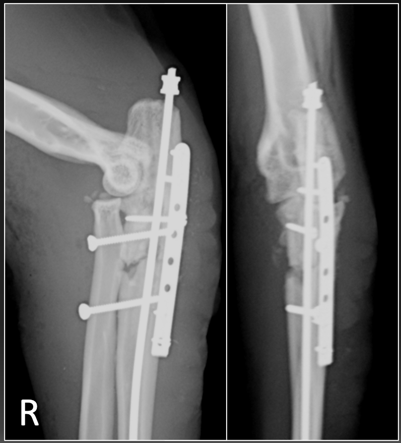 治療は、ギプスなどの外固定と呼ばれる方法も選択肢の一つですが、この状態でバンテージなどで完治させることは困難であり、外科手術を実施しました。手術では髄内ピンと呼ばれるピンを挿入後、プレートにて骨片を固定しました。また、橈骨と尺骨がずれないように、スクリューを打ち込みました。