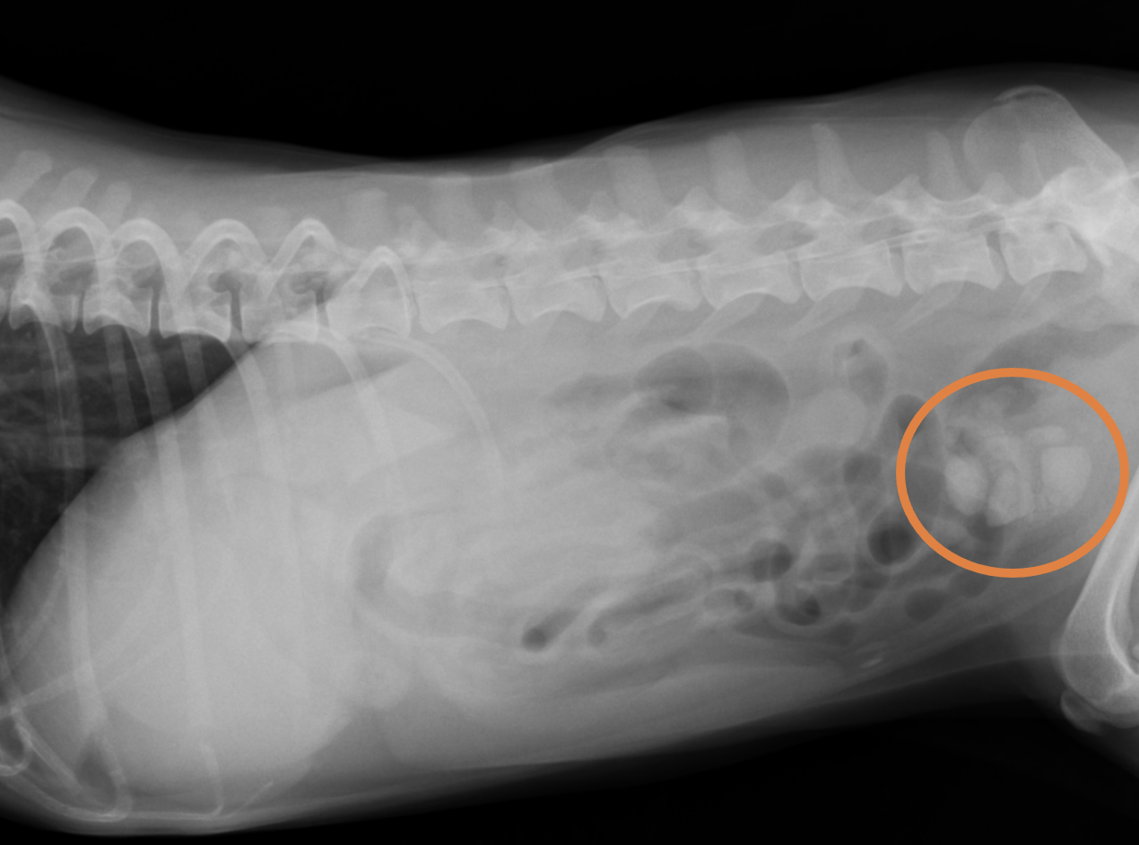 12歳、女の子のわんちゃんです。血尿と嘔吐、排尿姿勢をとるものの尿が出てこない、を主訴に来院されました。各種検査を行いましたが、レントゲン検査により、膀胱内に結石が複数個確認されました。下のレントゲン画像に示すとおり、膀胱の中に1cm程度の白い構造物が見えます。