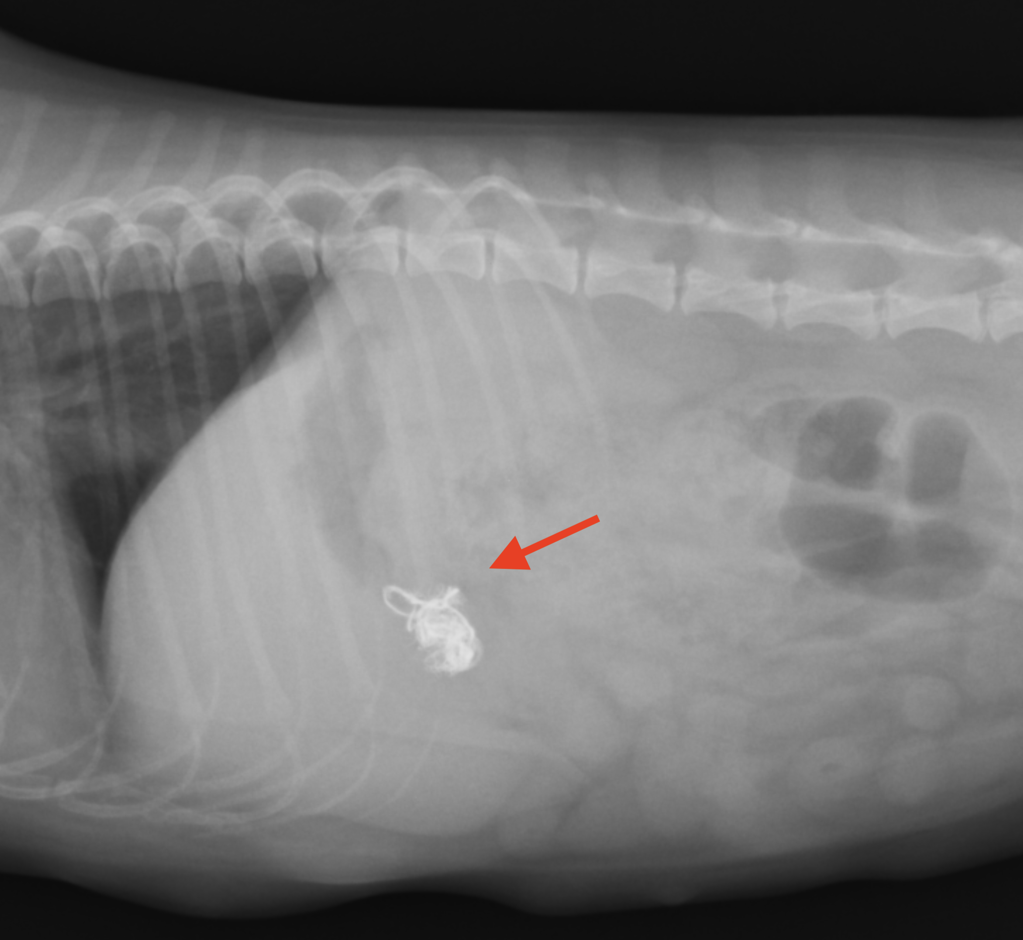 レントゲン検査で確認された白いコード状の異物(赤矢印)