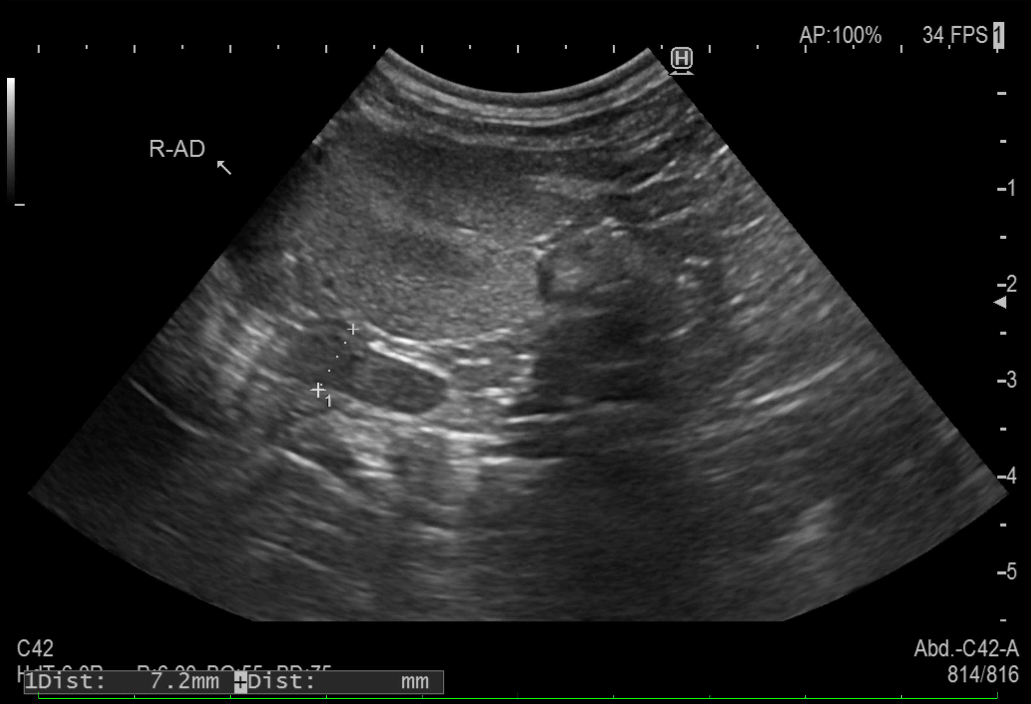 健康な子の場合、副腎の短径の最大径が3〜5mm程度、大型犬では5~8mm程度です。