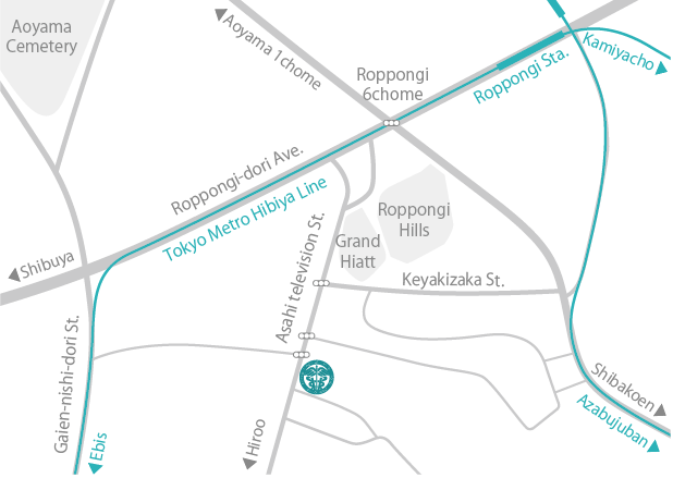- By Car : Along the Asahi television street. (2mins from Roppongi 6Chome intersection)